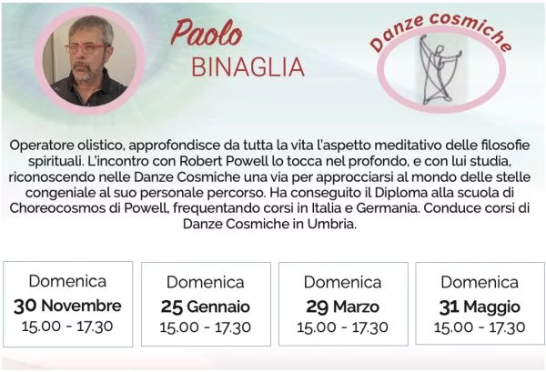 Operatore olistico, approfondisce da tutta la vita l’aspetto meditativo delle filosofie spirituali. L’incontro con Robert Powell lo tocca nel profondo, e con lui studia, riconoscendo nelle Danze Cosmiche una via per approcciarsi al mondo delle stelle congeniale al suo personale percorso. Ha conseguito il Diploma alla scuola di Choreocosmos di Powell, frequentando corsi in Italia e Germania. Conduce corsi di Danze Cosmiche in Umbria.