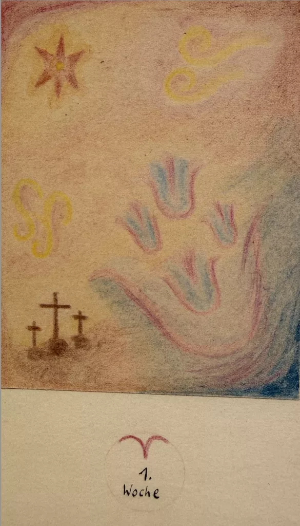 La prima settimana dell’anno nasce sotto il segno dell’Ariete: della Resurrezione che inizia dal Golgota, dalla testa, e parla del sacrificio dell’animalità. König ne riporta infatti il simbolo cosi eloquente in basso, sopra il numero 1.