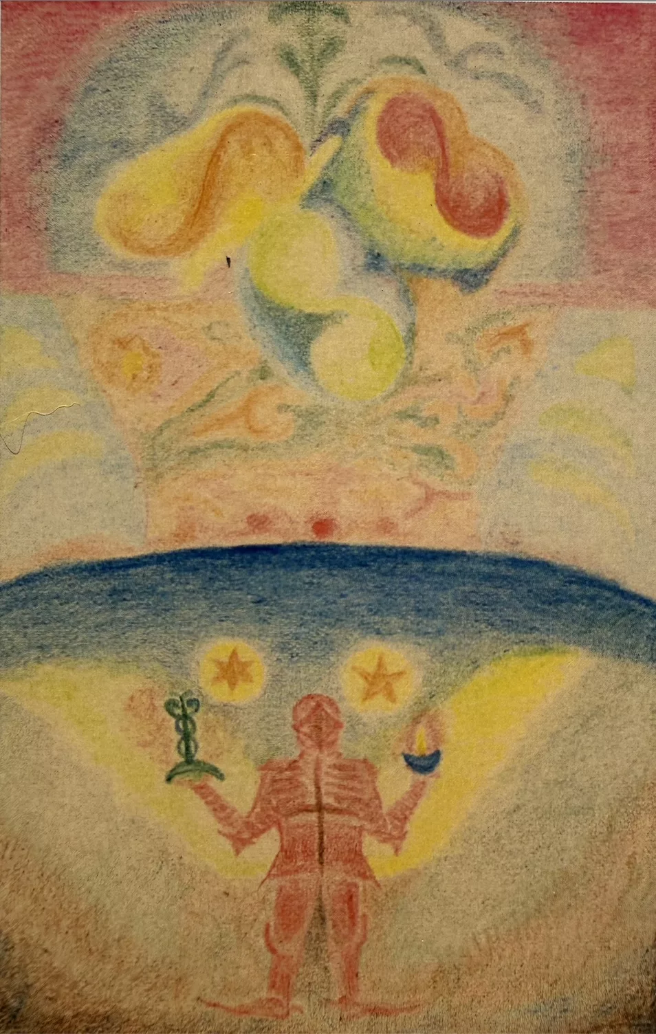 Sono visibili due centri che riguardano l’uomo nel disegno tripartito, in primis il cuore rosso che compariva anche nel 46: qui è tra …le acque superiori e quelle inferiori. E poi soprattutto la Croce che è parte integrante dell’armatura nella sua zona toracica-ritmica. Ecco quel che diceva San Paolo nel capitolo 6 della lettera agli Efesini. Rivestitevi della completa armatura di Dio, affinché possiate stare saldi contro le insidie del diavolo (v.11).