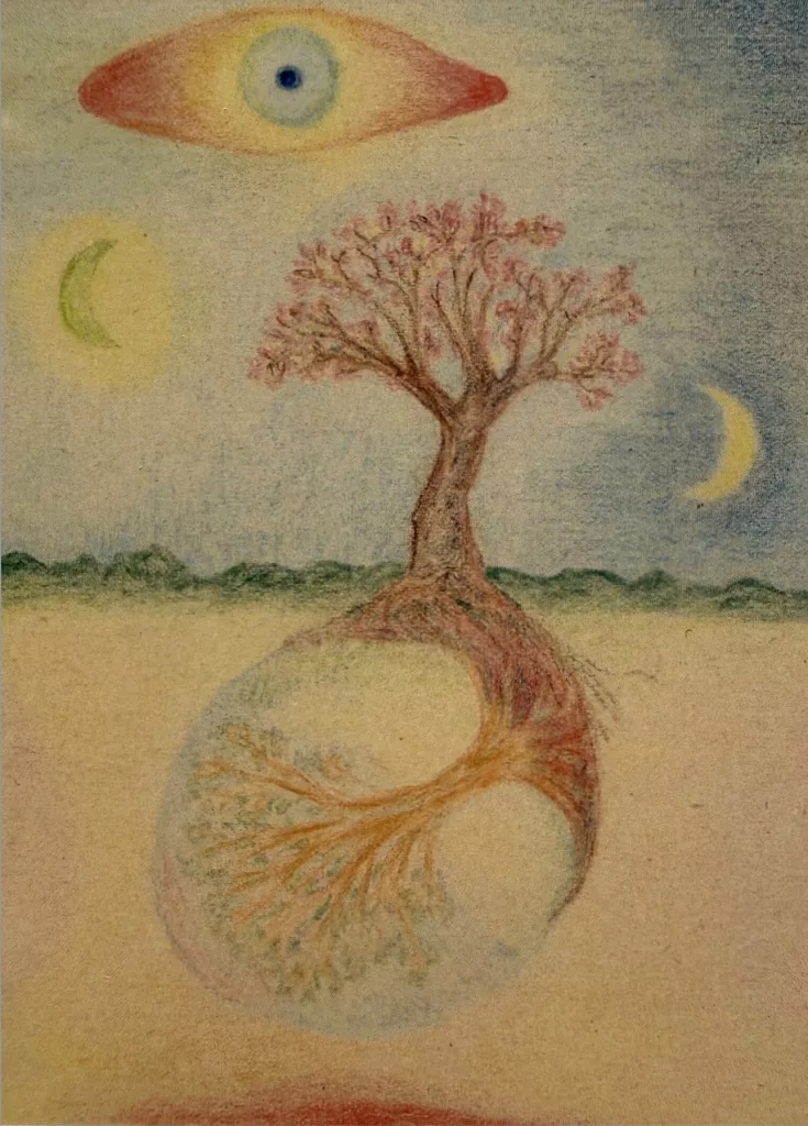 Sotto la superficie terrestre – la fascia ondulata verde – e sotto le radici della pianta, König disegna una riproduzione anatomica dell’occhio umano – che è produzione della natura proprio come l’albero che vi si rispecchia. Le radici dell’albero si trasformano in un bulbo oculare!, con un nervo robusto che si dirama in fitti capillari, rispecchianti la chioma fiorita.