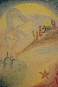 Scendono quindi verso l’angolo in basso a sinistra, alla città del Tempio, scendono giù verso il passato dell’evoluzione portando luce e vita, mentre in basso a destra rifulge l’amorevole stella a cinque punte del sé spirituale: il primo stadio della possibilità della risalita per l’uomo verso lo spirito. La stella a cinque punte, immagine del futuro imminente dell’umanità, qui sembra una stella marina, posta alla base della collina come un tempo il cranio di Adamo. Accennerebbe al Sabato Santo, quando con la discesa agli inferi verrà fondata per ogni uomo la possibilità della risalita.