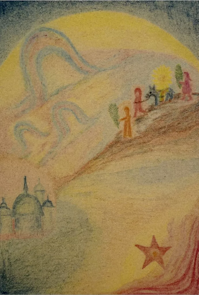 Le due palme potrebbero riferirsi ai due corpi dell’uomo già solarizzati, cristificati durante le prime due Pasque, l’astrale e l’eterico, mentre la terza figura conduce l’asino giù dalla collina: è sul fratello asino – San Francesco così chiamava il suo corpo fisico – che si concentra la trasformazione finale da parte dell’Essere del Sole nella terza Pasqua.